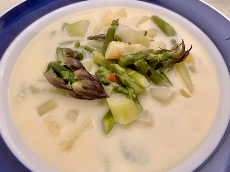 bei uns gab und gibt es mal wieder kartoffel-spargel-sahne-suppe