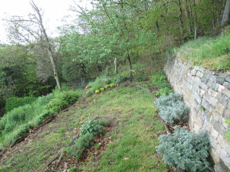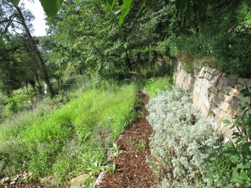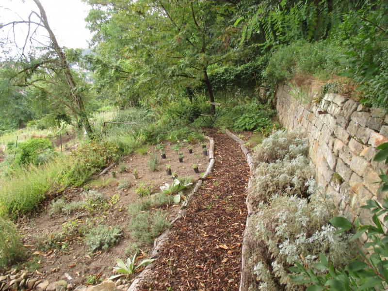 Ursprünglich dachte ich mir einen Grasweg hin zum Sitzplatz und einen zweiten zurück zur nächsten Ebene. Jedoch hat sich daraus ein sehr schmales Beet ergeben, das für mich extrem gezwungen aussah. Außerdem war der Grasweg sommers immer verbrannt.