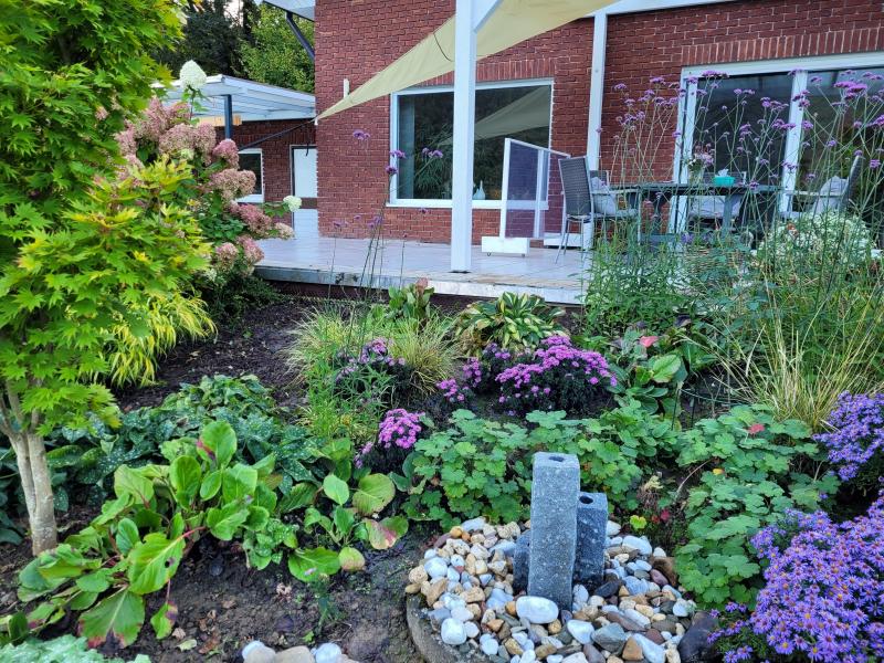 Bei der Nordostlage, dem Regen von oben und dem Oberflächenwasser von der Terrasse muss ich umdenken. Ich habe spontan auch das nie blühende, alte Geranium macrorrhizum heraus gerissen. Es sind sicher noch Wurzeln drin, die kommen noch raus. So wirkt das