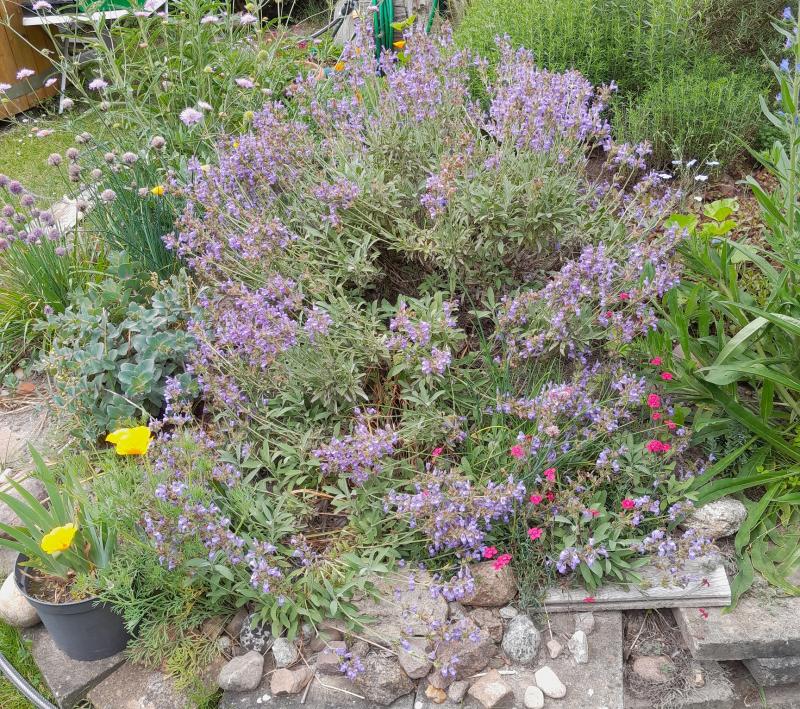 Salvia lavandulifolia hat sich mächtig ausgebreitet und ist ein Insektenmagnet.