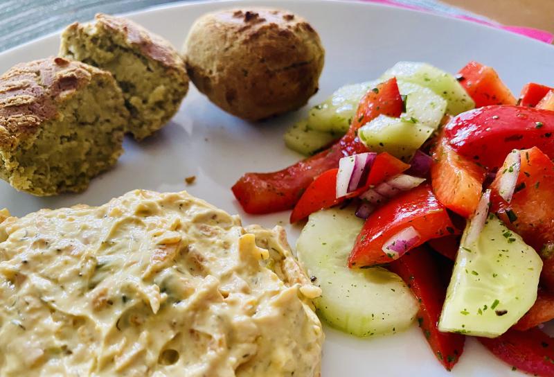 Wir hatten den Grill an ... Bratwurst mit Zaziki und auf die Schnelle gebackenes Weißbrot, bzw. es ist gelb geworden, hatte Ras el Hanout reingemischt.