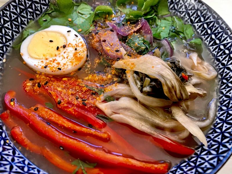 hier gab es, nachdem ich zum feierabend im garten in den regen kam, ein ramen–crossover. mit frischest geerntetem russischem kohl, ei (hartgekocht, lag hier gerade herum), roter zwiebel, spitzpaprika und sauer-aromatisch gepickeltem pak-choi