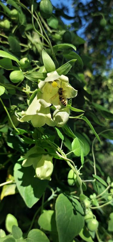 Der "Duft" nach Raubtierkäfig der Tigerglocken lockt Wespen an, und zwar den ganzen Tag. Es kann nicht nur die Suche nach Nektar und/oder Pollen sein, denn jede Blüte wird immer wieder besucht und auch gegen andere Wespen verteidigt. Das beobachte ich in dieser Heftigkeit zum ersten Mal in diesem Jahr; vielleicht liegt es am allgemeinen Mangel an Blüten, die zudem in diesem Jahr wegen der Trockenheit an der Nektarmenge sparen müssen. Codonopsis pilosula...