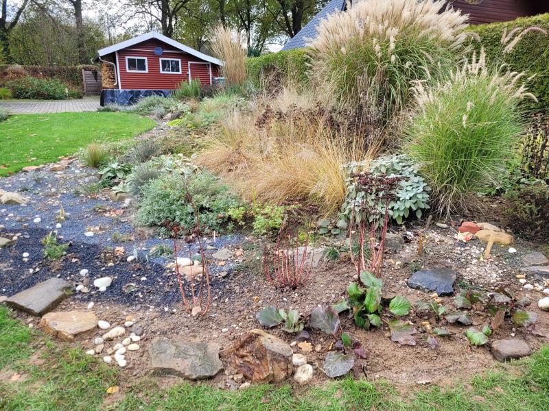 Im Oktober hatte ich bei den warmen Temperaturen ja das 'Steppenbeet' erweitert, da ich Sonnenplätze für Iris 'Morgendämmerung' und 'Champagne Waltz' brauchte. Dazu kamen Salvia nemorosa 'Adrian' und Geranium sanguineum 'Album, da auch diese nach etwas mehr Platz und Sonne fragten. Außerdem hatte ich noch einen kleinen Lavendel und diverse Hauswurzen ... In die Lücken in Beetmitte kamen noch zwei Perovskia 'Little Spire', die ebenfalls zu beengt standen. :D Das sollte es sein für dieses Jahr. Aber beim heutigen Gartenrundgang war das Klima erstaunlich angenehm. Ich habe daher spontan noch drei Horste von Sedum 'Matrona' nach vorne geholt, da sich Pennisetum 'Karley Rose' üppigst ausgebreitet hatte und diese bedrängte und beschattete. Also mussten die gerade erst vorgepflanzten Bergenien wieder weichen und das Beet noch ein wenig erweitert werden. Kettenreaktion... :) Das ging sehr gut und die Gärtnerin war voll im Flow... ;D Solche Aktionen dokumentiere ich immer fotografisch für mich, damit ich im Frühjahr noch weiß, was da alles kommt. ::) Da kann ich es Euch auch direkt mal zeigen. ;)