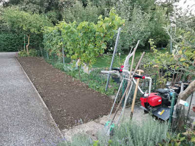Pflugkante zum Weg mit dem Spaten gezogen, Beet Glattgekrailt, erstmal einen Tag liegen und den sonnig-warmen Tag ausgenutzt zum abtrocknen lassen. Mit dem Fächerbesen Splitweg wieder in Ordnung gebracht.