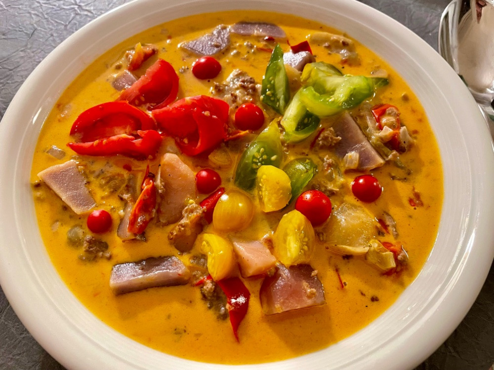 resteeintopf mit in olivenöl gebratenen weißen zwiebeln, schalotten, rinderhack, gartengewürzpaprika und gartengurken, dazu apfelessig, meersalz, frisch gemahlener schwarzer pfeffer, gartenkartoffeln, gartentomaten, sahne