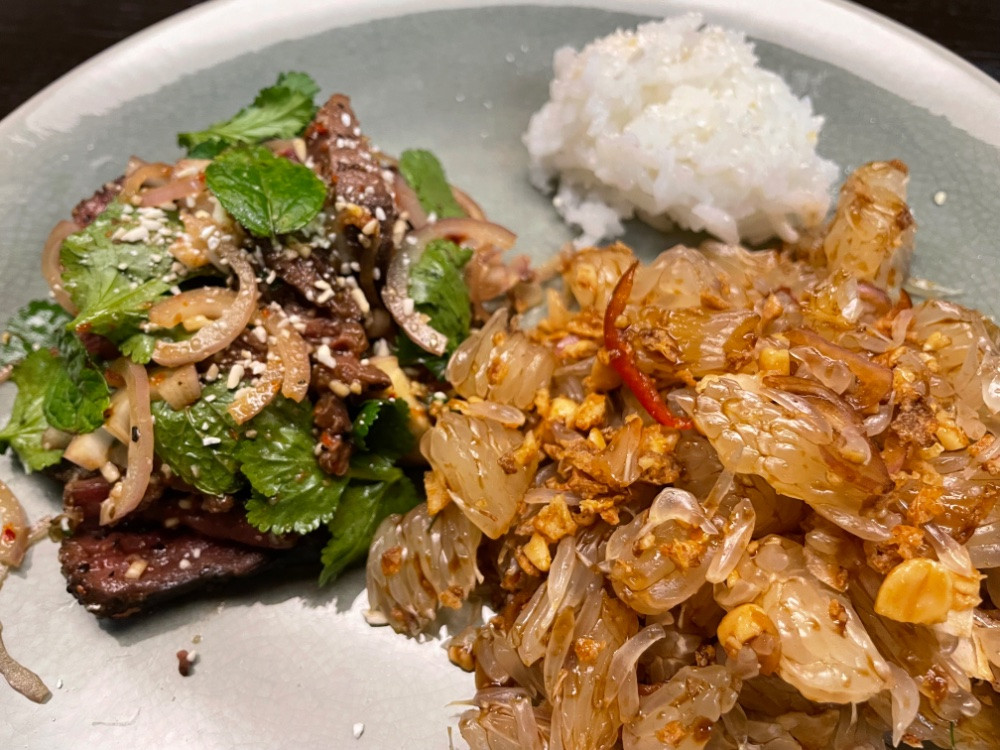 Bei uns gab es heute Nam Tok mit einen würzigen Pomelosalat. Das hat wunderbar zusammen gepasst. :) Das Rezept für den Pomelosalat habe ich hier entdeckt.