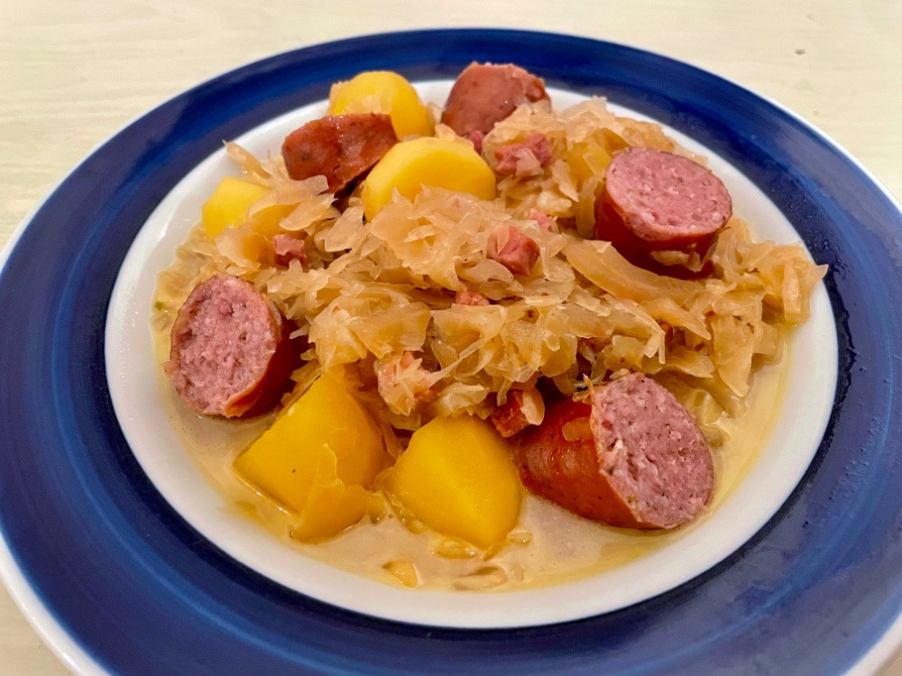 hier köchelt gerade das letzte letztjährige hausgemachte sauerkraut mit schinkenwürfeln und kohlwurst und ich ärgere mich, dass ich es nicht doch vor dem anbraten abgespült habe. ich wollte es nicht mau haben, aber das ganze ist nun doch etwas arg sauer.