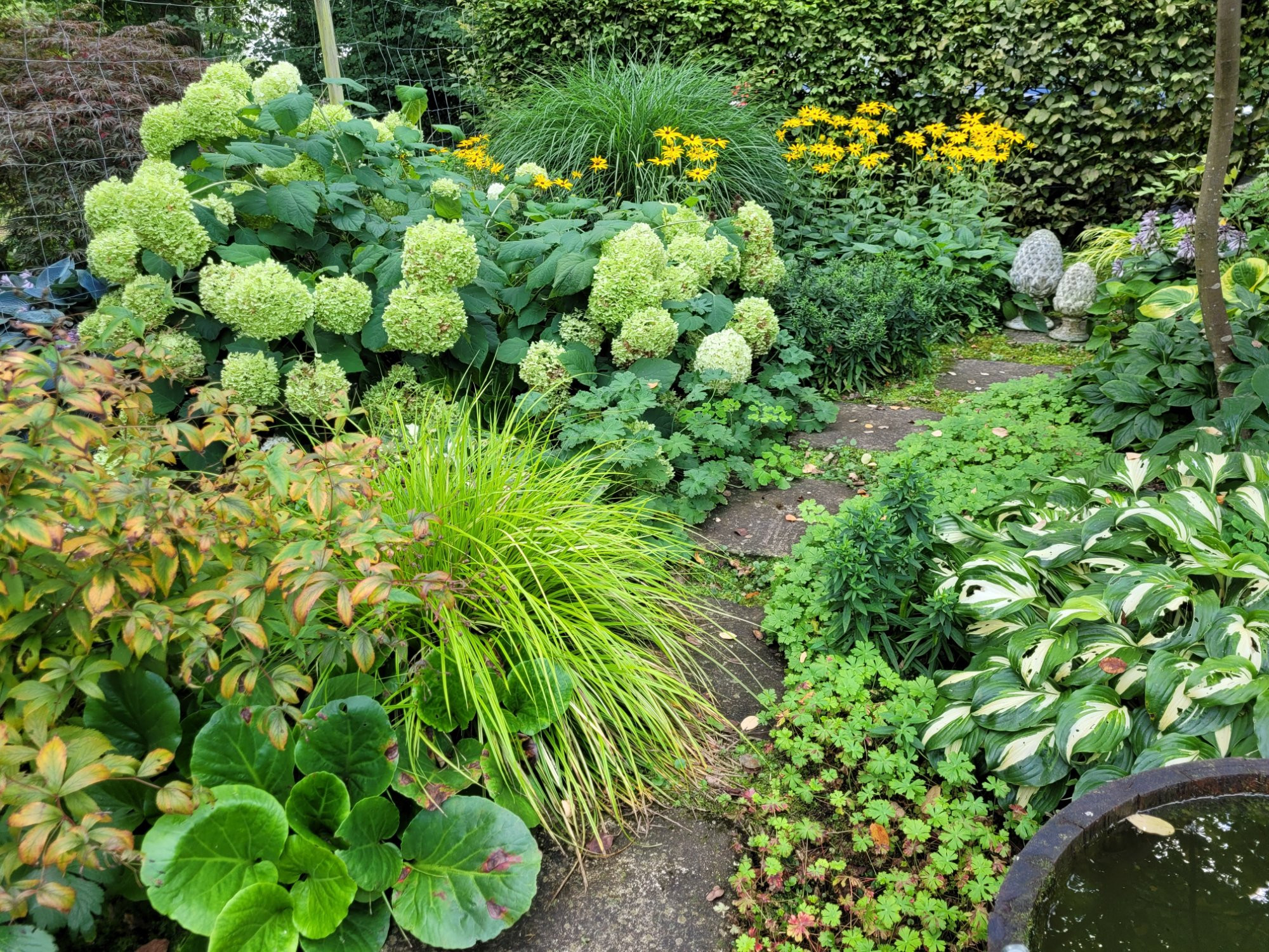 Zumal überall im Garten die Schafskopfhortensien standen wie eine Eins.