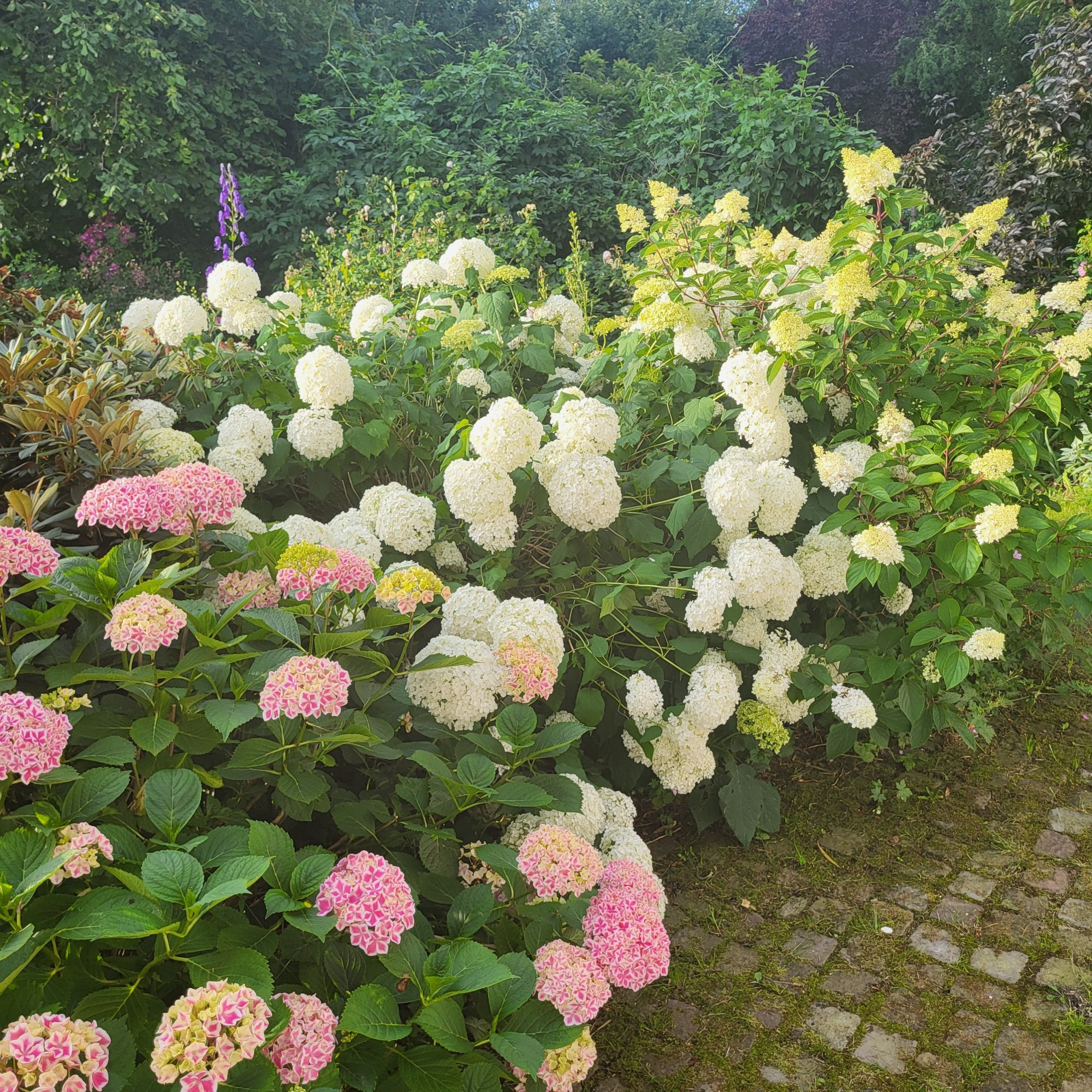 Im MSG-Forum gab es den Vorschlag, Annabell mehrfach zu pinzieren. Das habe ich ein paar Jahre versucht, der Erfolg war mäßig. Jetzt schneide ich sie gar nicht mehr , sondern halte die Hortensie relativ schmal. Was sich nicht deutlich innerhalb der Stütze befindet, wird rigoros entfernt. Außerdem helfen stützende Nachbarn ein halbwegs akzeptables Bild zu erhalten. Ich habe gerade aktuelle Fotos gemacht, Moment