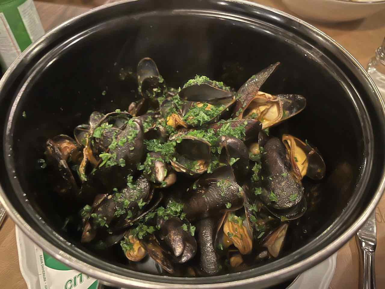 Abends dann in der Altstadt von Locarno als Vorspeise Cozze marinara und als Hauptgericht Wolfsbarschfilet: