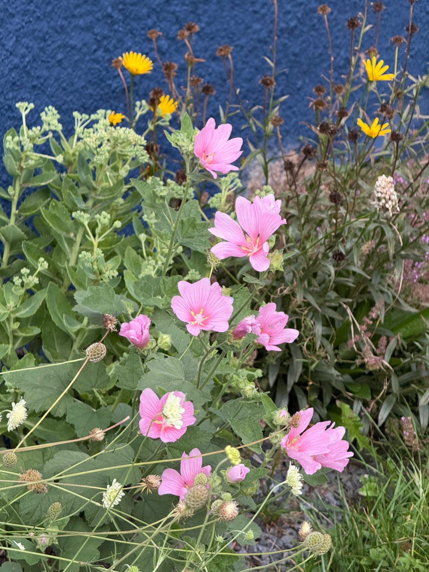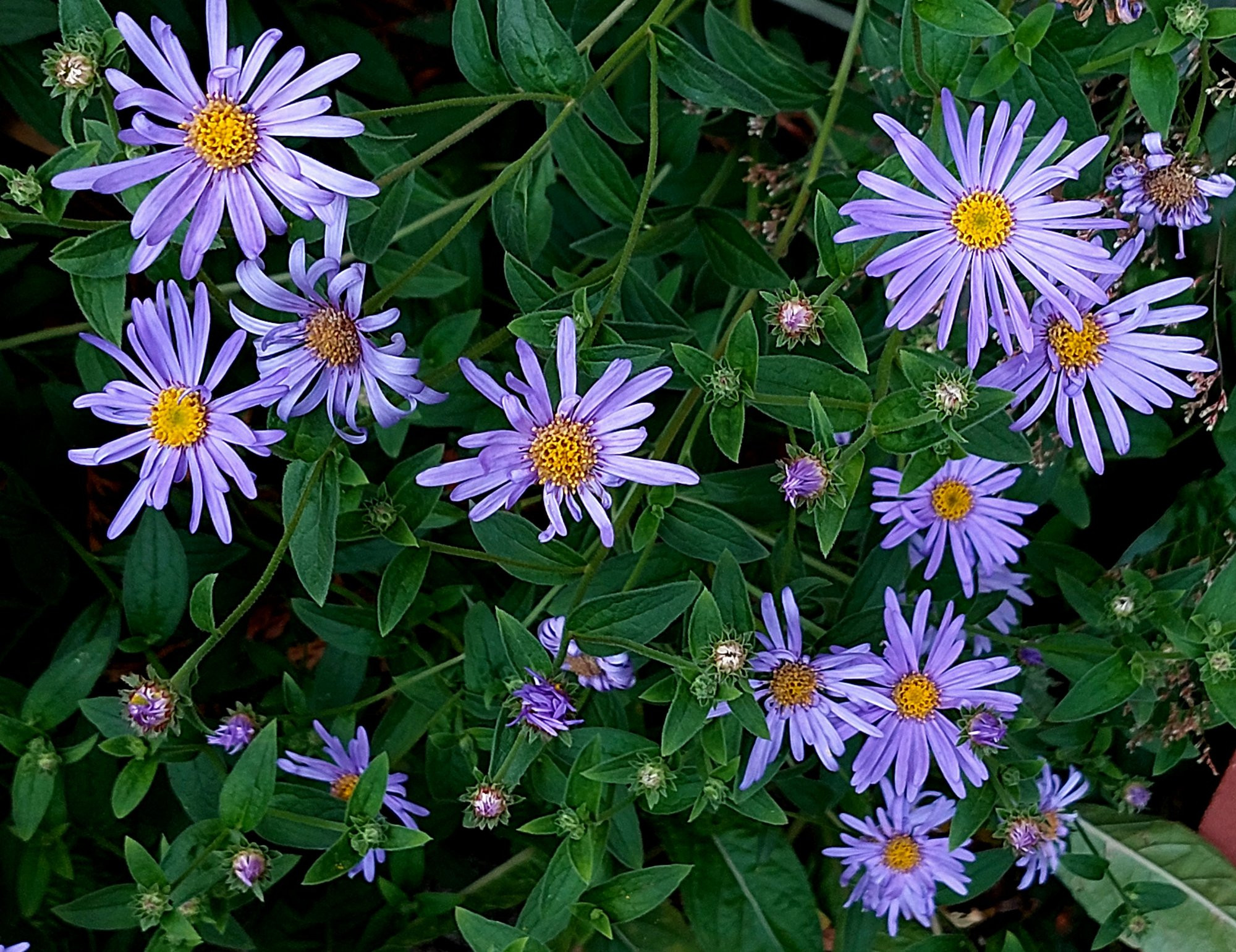 Aster frikartii `Wunder von Stäfa ´, Chrysanthemum hortorum `Vreneli´ (?) , Aster frikartii `Mönch ´ .
