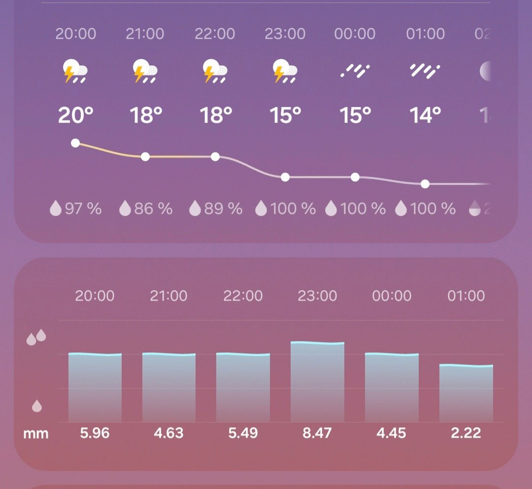 21 Grad, Gewitter, es schüttet... soll die ganze Nacht so weitergehen.
