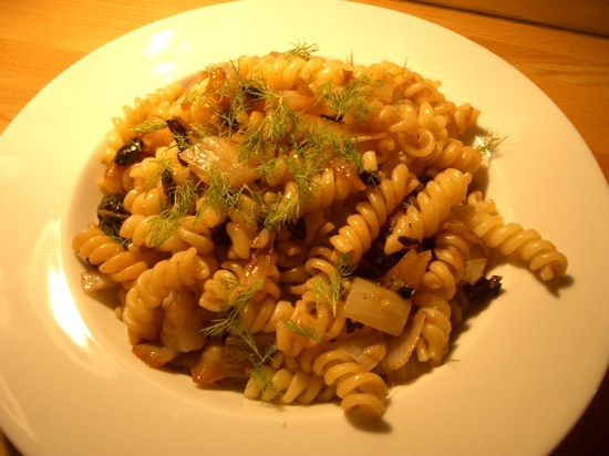 gestern abend einer unserer favoriten in der "winter"saison: in olivenöl und knoblauch gedünstetes fenchelgemüse mit schwarzen oliven, vermischt mit pasta.