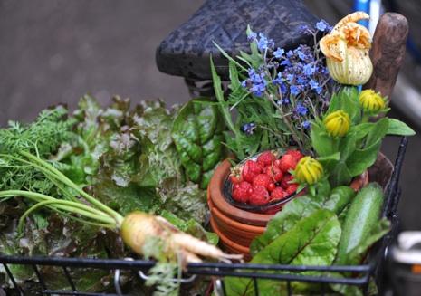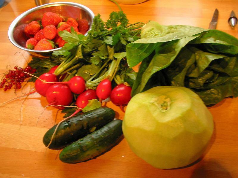 Salat, Zucchini, Erdbeeren, Kirschenund vom Nachbarn eine Gurke