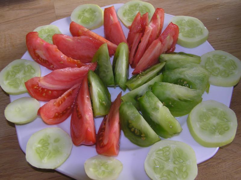 dazu gabs ein teller voll mit tomatenstücken und gurkenscheiben