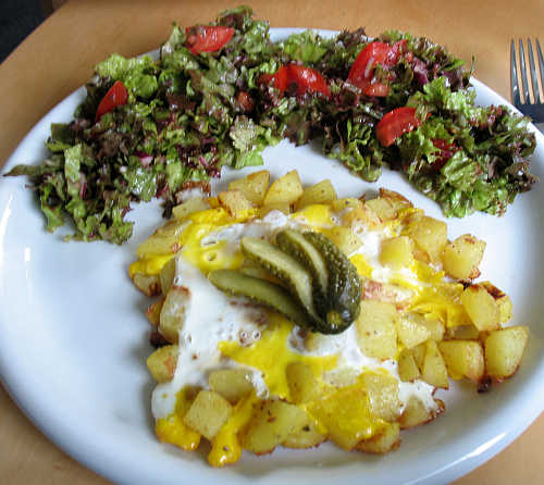 Heute bin ich allein zu Hause und habe mir ein Bauernfrühstück und einen Salat gemacht. Das ist eines meiner allerliebsten Essen als Kind gewesen.