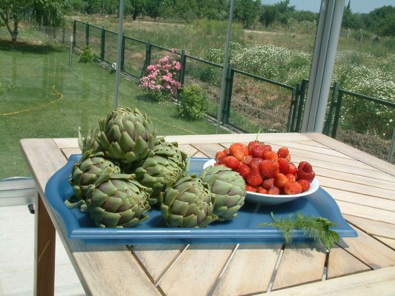 5 Kohlrabi und einige Mairübchen.Kirschen haben wir dieses Jahr auch keine und die Erbeeren werden von den Vögeln gefressen.