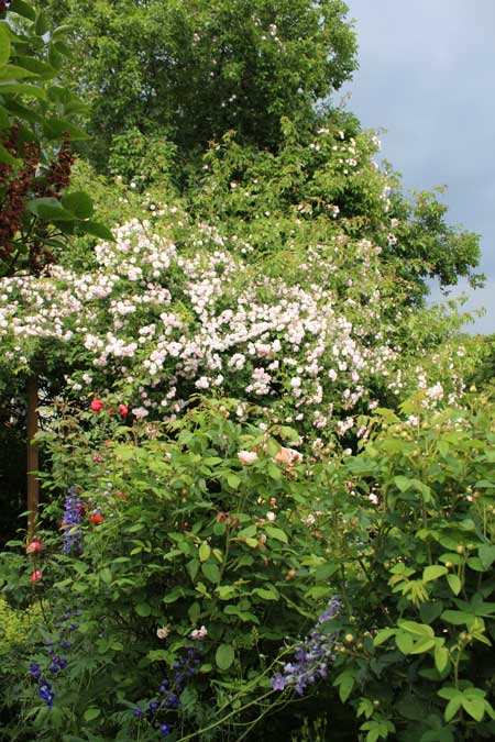 Und Kiftsgate, Paul's Himalayan Musk und Bobby James, die versuchen, einen alten, großen Pflaumenbaum umzureißen: