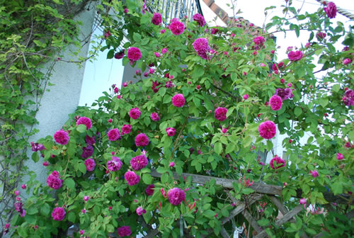 , hier eine ganz besondere Rose aus Anfang Juni einzustellen.Erinnerung an Brod.Sie steht am Eingang und man kann nicht einmal an ihr vorbeigehen, ohne ihre wunderschönen Blüten - die noch etwas dunkler sind in Wirklichkeit, zu bewundern und an den Blüten zu schnuppern.