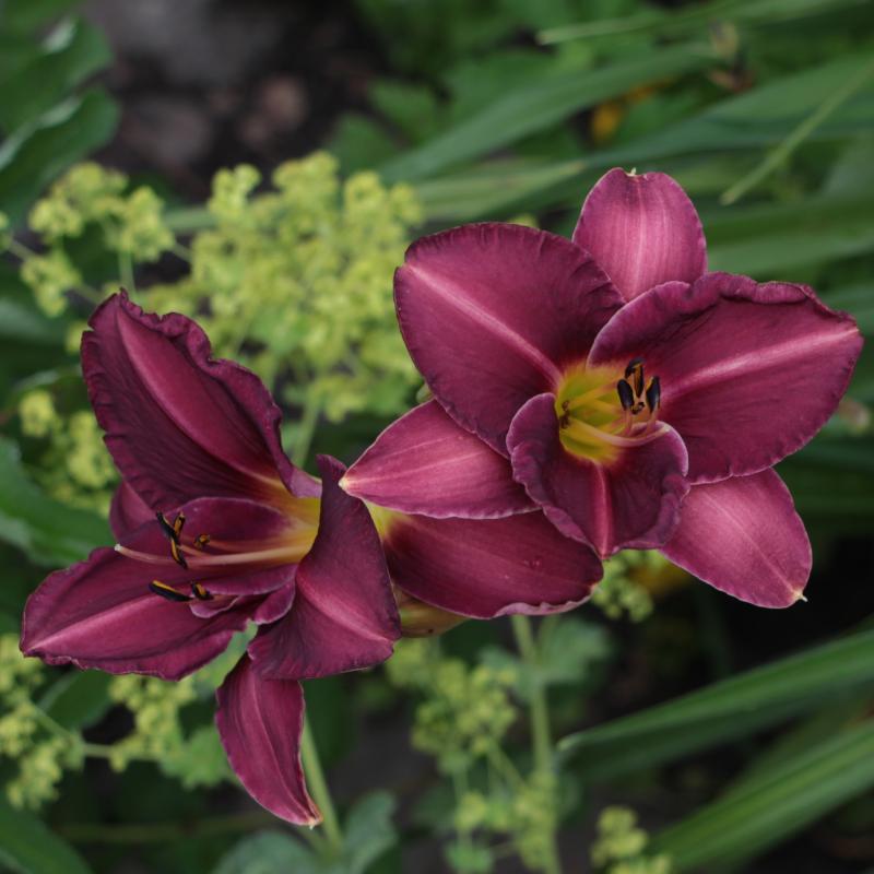 Taglilien im Topfquartier zwischen Geranium phaeum. Bei der übertriebenen Nässe ist alles etwas größer als gewöhnlich.