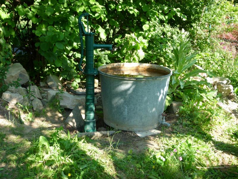 Ja, ich habe Wasser, zum Glück. Der Garten hat einen Wasseranschluss an der einen Seite und auf der anderen habe ich einen Brunnen schlagen lassen, der gut Wasser führt. Die Hälfte mit dem Wasseranschluss wird mit dem Schlauch gegossen, die andere Hälfte mit dem Brunnen von Hand gepumpt und mit Gießkanne gegossen.