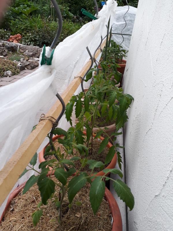 Bei dem derzeit richtig miesen Tomatenwetter bin ich froh, dass ich mir die Mühe mit der Konstruktion um's Hauseck gemacht habe. Die Pflanzen gedeihen hinter dem Vlies recht gut und bei den meisten sind nun auch die ersten Knospen zu sehen :)
