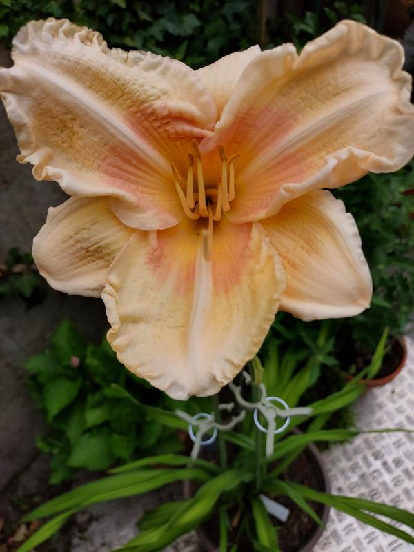 Die erste geöffnete Blüte von 'Peggy Jeffcoat' heute. Im vergangenen Sommer kam sie auf weit über 30 Blüten.
