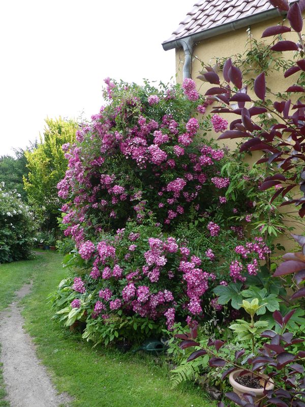 Ich liebe ja gartenhaus- und beetfressende Rosen. :D Sehr malerisch, das berankte Gartenhaus, bleibt auch mal Zeit, um auf der Bank zu sitzen?