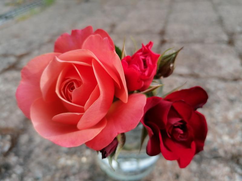 'Coral Lions Rose' 'Cherry Girl' und 'Roter Korsar'
