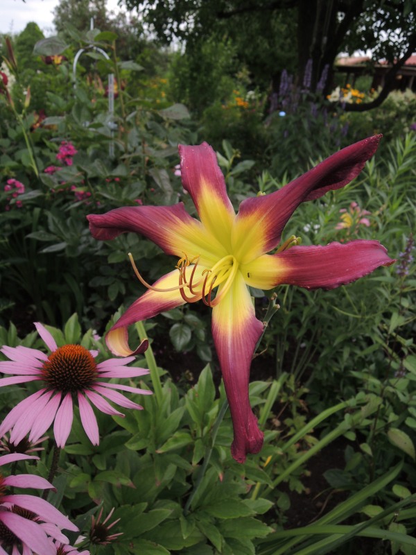 Waldschrat, die unbekannte samtig rote Taglilie erinnert mich an 'Persian Ruby'. Hier auf dem Foto ist sie leider sehr sonnenverbrannt. (hat sich dem Acer angepasst)