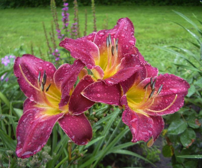 Erstes Foto aus der Regen-Session (ich bin wirklich mit Regenschirm um die Beete gestakst und auf der Wiese gluckerte es nur so vor sich hin...)Sheik of Araby (Moldovan 1984)@Martina777: Weil du kürzlich nach Taglilien in der Farbe von Blutweiderich oder zu diesem passend (richtig verstanden?) gefragt hast, s. Hintergrund. Der Blutweiderich beginnt jetzt gerade erst mit der blüte, aber so ad hoc finde ich die Farbkomposition eigentlich recht harmonisch.