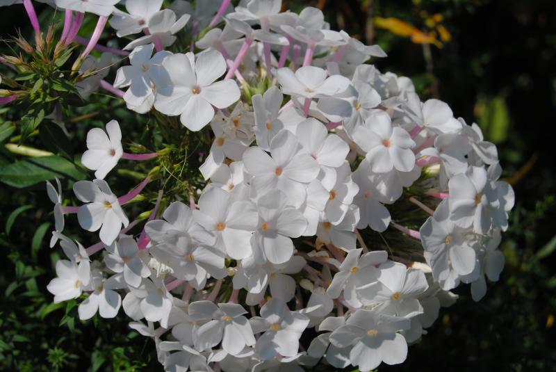 Das erinnert mich an eine alte Phloxsorte .'Schneeberg' -vor 1940- weiß; 90-120cm; 3,0cm; mittel-früh; M: Antoinette Six.Ich werde die Details auf dem Foto zeigen. Er erinnert manchmal an Phlox Fujiyama, hat aber runde Blüten und blüht früher. Collage - alte Folie aus der Phlox-Sammlung des GBS (rechts) und das Bild aus dem Katalog K. Foerster (links).Klingt wie Ihr Phlox?dieser etwas kleinblütigere kämpft sich hervorragend durch die hitze an vollsonnigem platz, ohne gießen