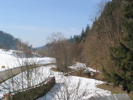 Auch bei uns strahlender Sonnenschein. Allerdings noch -3oC.Bild von soeben. Südost-Seite. Geschossen aus dem zweiten Stock, wo es gemütlich warm ist. Das Wäldchen überm Bach auf der rechten Seite ist schon vom Schnee und Eis befreit. Anders sieht es aus mit den Wiesen drum herum. Die Schneedecke sieht aus wie eine riesige Baisser-Masse.