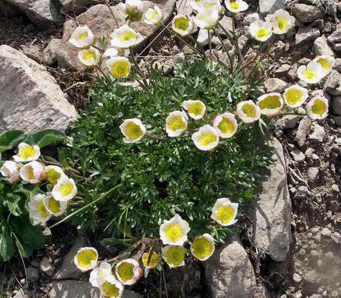 ???R. seguieri hat kompaktes Laub und behaarte (filzige) Blätter.R. alpestris hat glattes, glänzendes Laub.Seh doch bitte einmal nach, ebbie !So scharf sind meine Augen nicht, dass ich anhand des Photos dies erkennen kann ?!Wo liegt eigentlich der Pordoipass ? Die Verbreitung von R. seguieri liegt in Südtirol, nach Osten in den Süden von Österreich.In Frankreich gibt es auch Vorkommen.Ne ganze Menge!Die Blätter sind schwer zu erkennen.Wenn es auf Kalk ist, was würde gegen R. alpestris sprechen ?Details sind leider keine zu erkennen, aber es müßte sich um R. glacialis handeln (wenn auf Urgestein wachsend). Die Kalkvariante davon heißt R. seguieri und ist im Gegensatz zu voriger Art auch längere Zeit zufriedenstellend kultivierbar. Seh gerade, das auf dem Bild deutlich Kalkgestein ansteht. Damit handelt es sich definitiv um Ranunculus seguieri.