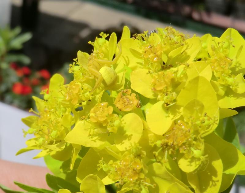 Der Krabbenspinne hat es nichts ausgemacht und die Hummel war eh schon tot. Heute sah ich die Spinne mit dem nächsten Opfer, diesmal hat sie eine Honigbiene erwischt.