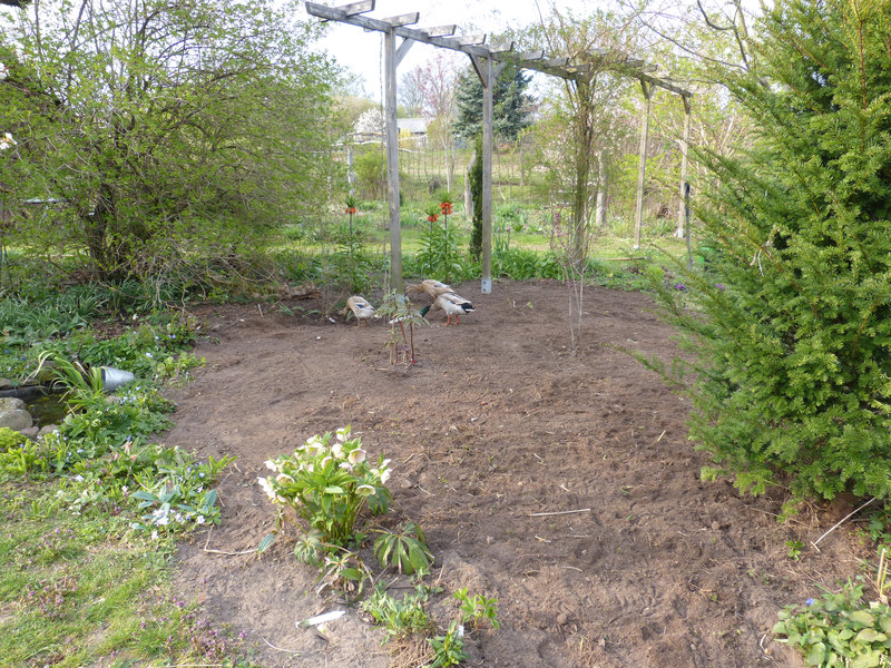 Seit längerem hatte mich das verwachsene Mittelbeet gestört. Die Bepflanzung war nach und nach mit wenig Planung entstanden. Inzwischen hatten Wucherastern, Waldsteinia, Walderdbeeren, Brennnesseln und Federmohn das Zepter übernommen. So konnte das nicht bleiben. Die Rodung des heftig ausläufernden Calycanthus floridus im Herbst war sozusagen eine Initialzündung, dieses Beet endlich mal aufzunehmen und neu zu bepflanzen. Im Topfquartier wartet schließlich genug Grünzeug auf einen Platz im Garten.