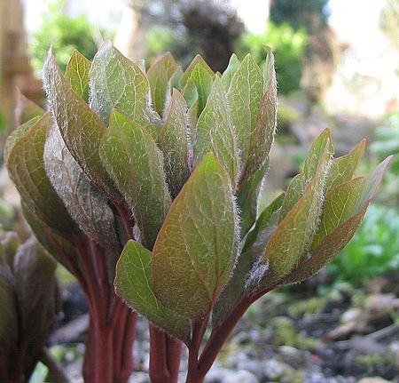Die rechte hingegen scheint eine Paeonia officinalis var. huthii zu sein. Zumindest hat sie eine auffällige Behaarung auf der Blattunterseite.