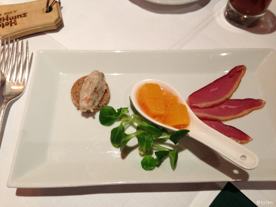 anbeiNeues von "Schlawinchen" - so schoen kann Skifahren, insbesondere danach sein... ;DGaenserillette mit Kuerbisgemuese suess-sauer und geraeucherter Entenbrust