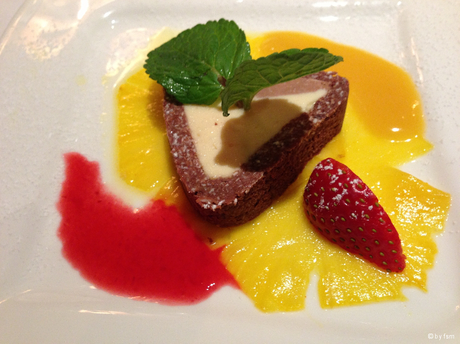 Zum Dessert Halbgefrorene Schokolademousse auf Ananas-Carpaccio mit Safran-Mangospiegel