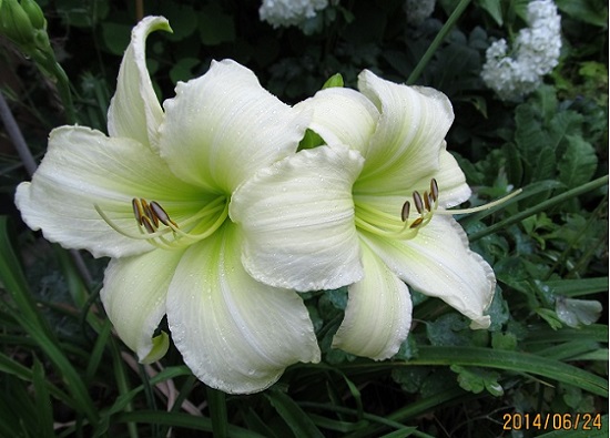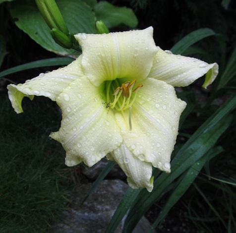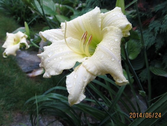 Heute nach einem Wolkenbruch gestern Nacht regnet es vor sich hin - trotzdem haben einige Sorten recht gut geöffnet: Guardian Angel ist neu und übt noch, die Flügel schön zu spreizen - die ausgefallene Blütenform ist schwer zu fotografieren. Eine eher kleinblütige near-white Sorte: