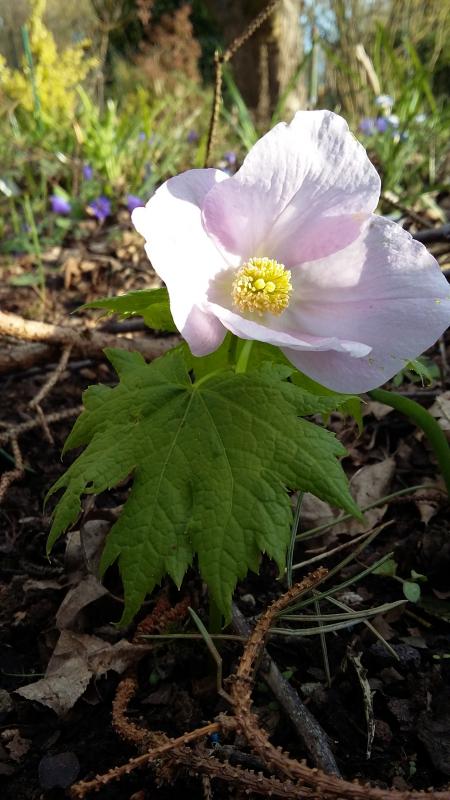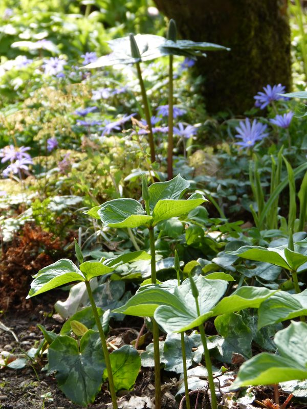 Aus dem großen Garten hatten wir Glaucidium mit umgezogen. Dort hatte er nicht geblüht (im Jahr nach der Pflanzung hatte ich zuviel nach nach ihm gebohrt, ob er kommen würde - hatte ihn dadurch geköpft). Im letzten Frühjahr trieb er dann doch - allerdings ohne Blüte. Hier ist er jetzt auch wieder da, noch sehr klein aber immerhin er wächst. Also alles paletti.