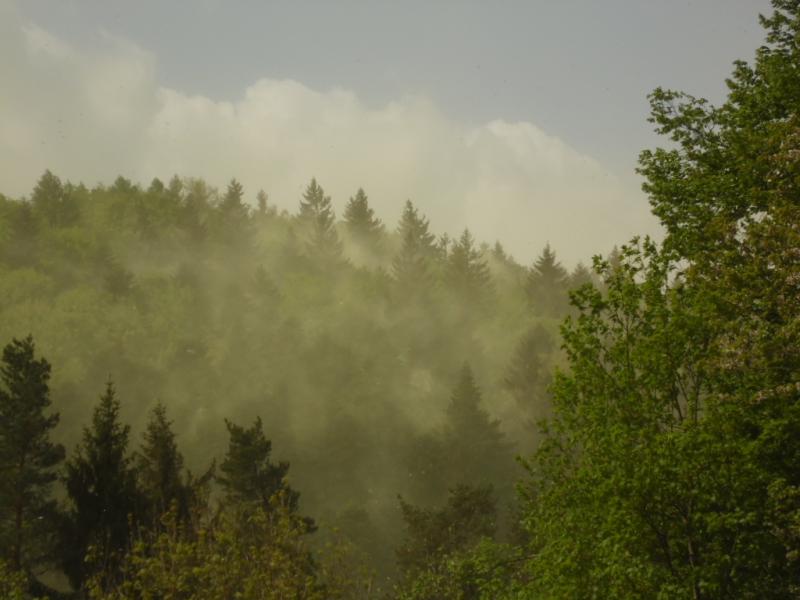 Trotzdem ist es draußen momentan kaum auszuhalten. Der Blütenstaub nimmt einem den Atem, trübt die Sicht und legt sich sofort auf und in alles.