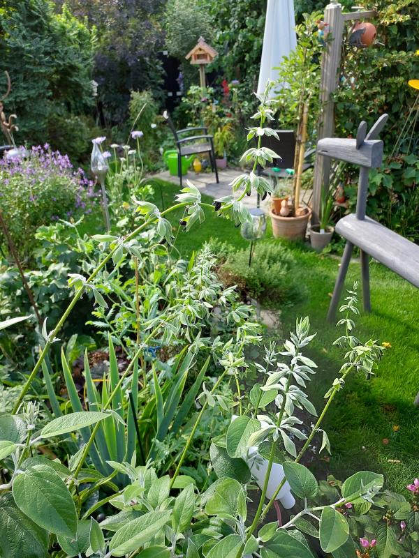 Dreierlei vom Salbei, Amistad, Nachtvlinder und unbekannter blauer mit Elsholtzia. Nicht, dass es schon genug Pötte wären, gestern habe ich zur Hebung der schlechten Laune noch eine unvernünftige Trost-Bestellung getätigt, man kennt das ja, je näher es auf Mitternacht zugeht, desto unkontrollierbarer der Bestellfinger. ::) Demnächst wird also hoffentlich noch Salvia bullulata 'Pale Form' das Trio bereichern.
