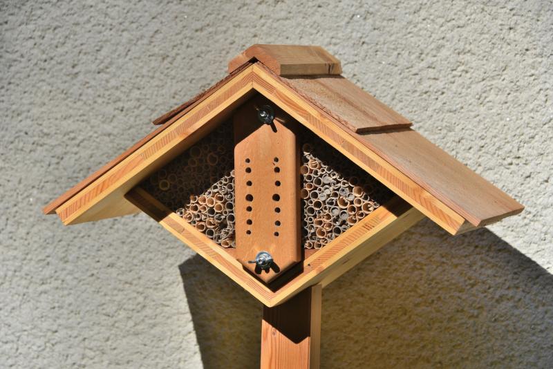 Ich hatte beim Wildbienenschreiner ein wunderbares "Bienenhotel" gefunden, welches nur leider seit Anfang letzten Jahres nicht lieferbar ist. Habe also die Holzwerkstatt angeschmissen und das ist dabei herausgekommen.