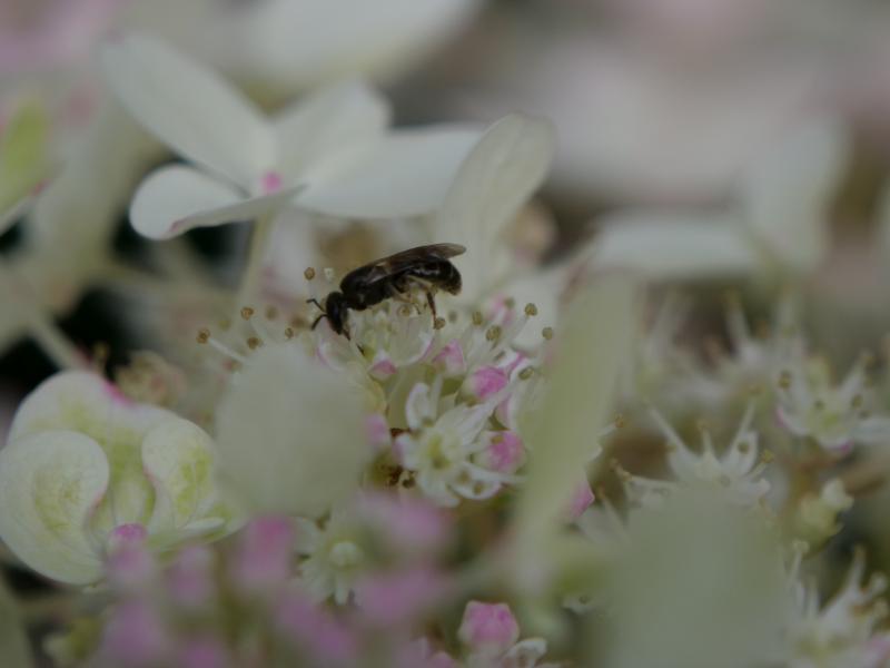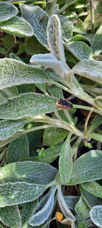 .Darauf aufmerksam wurde ich, weil ich direkt daneben Lavendel zurückgeschnitten habe und sich in dem Haufen etwas bewegte. Es bewegte sich aber nur das Laub, wer im Untergrund für die Bewegung sorgte, war nicht erkennbar. Nach einer Viertelstunde war die Neugier größer geworden als die Rücksichtnahme und ich habe ganz vorsichtig mit einem dürren Stengel das Laub von der Stelle gehoben, wo die Bewegung gerade zu sehen war. Eine Wildbiene flog auf und davon.