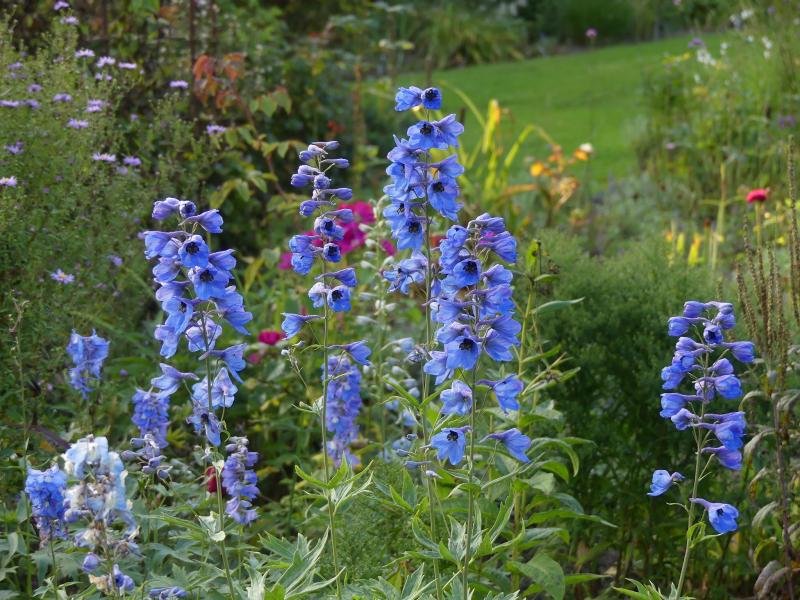 Leider sind diese Fotos schon wieder ein paar Tage alt .Ich wollte doch noch gern mal die blühenden Rittersporne zeigen.Leider fallen sie diesen Herbst etwas niedriger und magerer aus,obwohl ich sie nach dem Rückschnitt im Sommer gedüngt hatte.Vielleicht hätte ich sie während der nachfolgenden Trockenzeit regelmäßig wässern müssen,aber das ist hier immer etwas schwieriger zu machen.