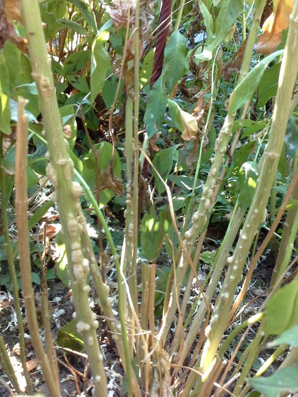 Eine Freundin hat mir dieses Bild ihres weißen Phloxes (wohl ´Fujiyama´) geschickt, der merkwürdige Auswüchse an den Stängeln zeigt. Kennt jemand dieses Phänomen und kann es erklären?
