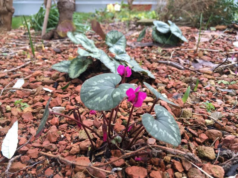 Jetzt im Winter ist das Cyclamenquartier entlang der langen Einfahrt unter uralten Rhodos ein Hingucker, der mich täglich erfreut. Blüten sind dabei nicht das Wichtigste.