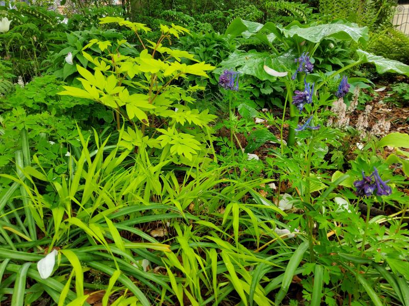 Und ich bekam letztes Jahr noch mehr von lieben purlern, hier Korn's Purple (meinen eigenen - der 2. Versuch - habe ich auch wiedergefunden und dazugesetzt). Er gefällt mir richtig gut neben der gelblaubigen Dicentra, das gelbgrüne Gras ist Hakonechloa All Gold, im Schatten etwas dunkler und schütterer als bei mehr Sonne. Die geschenkten C. flexuosa werden wohl etwas später links von der Dicentra blühen. ENDLICH habe ich blaue, die wiederkommen, vielleicht auch endlich Glück bei der Standortwahl. Auch hier ein dickes Danke an die Spender :-*.